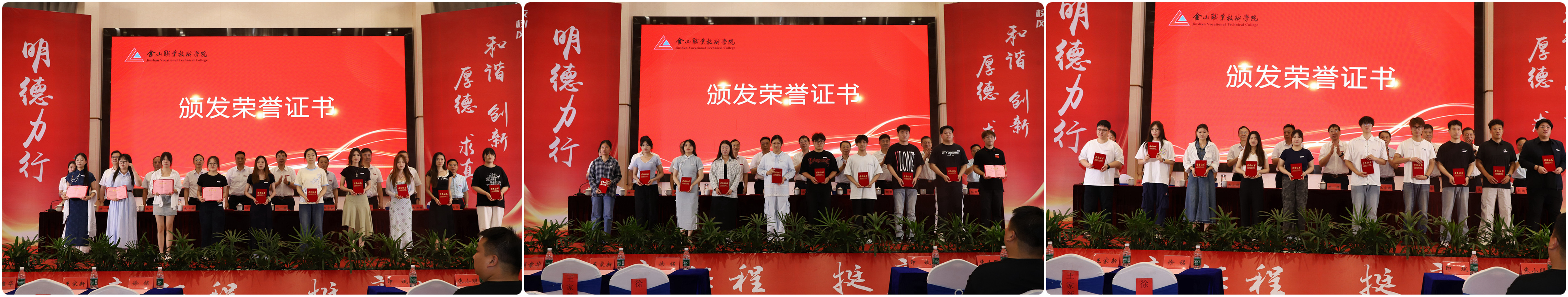 副校长陈刚宣读了《关于表彰2024-2025学年度2022级学生先进个人的决定》和《关于表彰2025届优秀毕业生的决定》。在热烈的掌声下,校领导依次为荣获“三好学生”、“优秀学生干部”、“优秀毕业生”称号的学生代表颁发了荣誉证书。