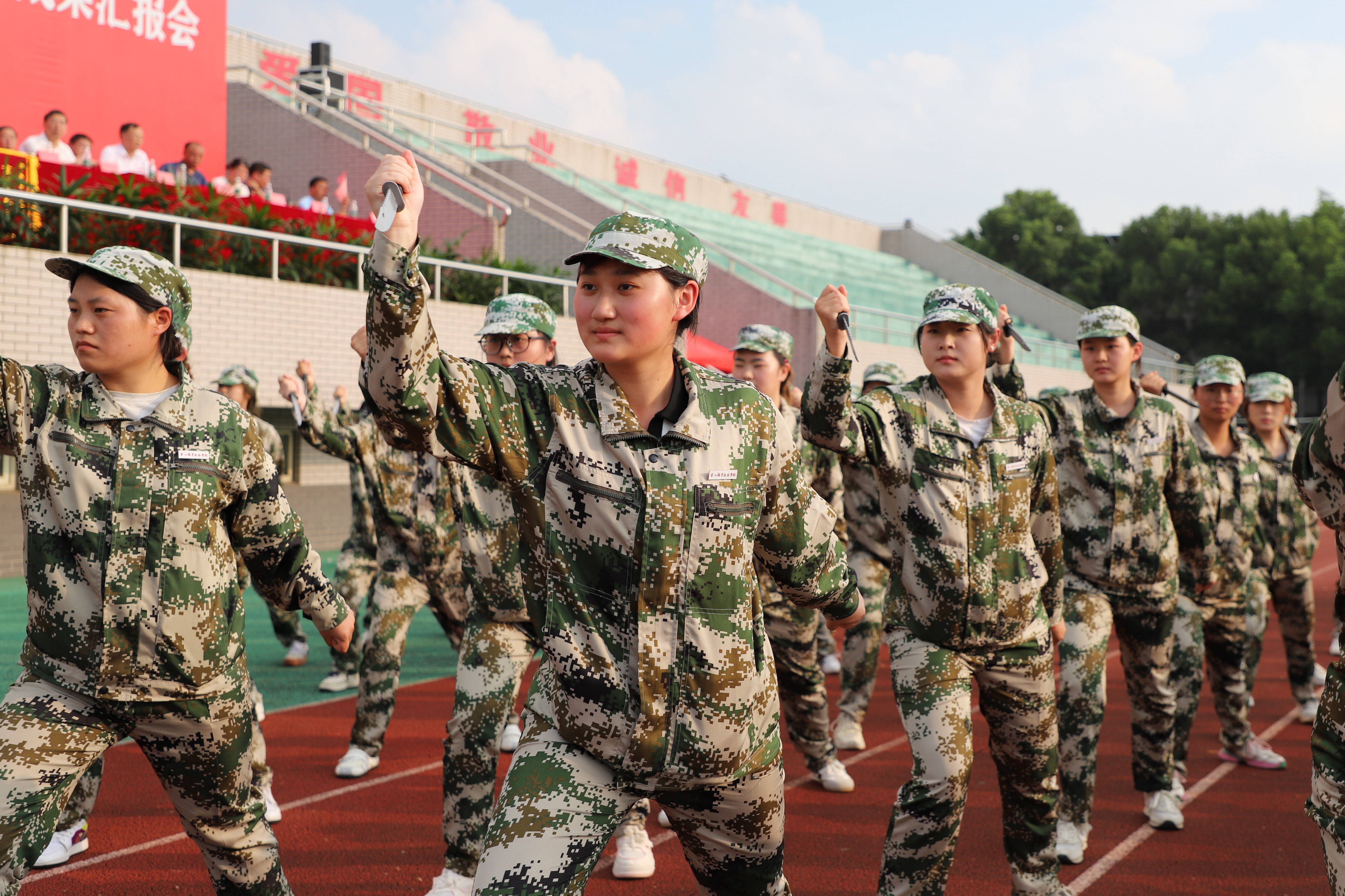 匕首操表演中,同学们手持训练匕首,动作干净利落、喊声震天,彰显出巾帼不让须眉的飒爽气势;
