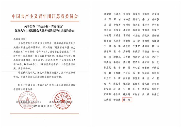 近日,共青团江苏省委发布了《“手绘乡村·青春行动”江苏大学生暑期社会实践专项活动评审结果》,我院建筑与艺术系22广告班韩瑜同学获评“优秀志愿者”。