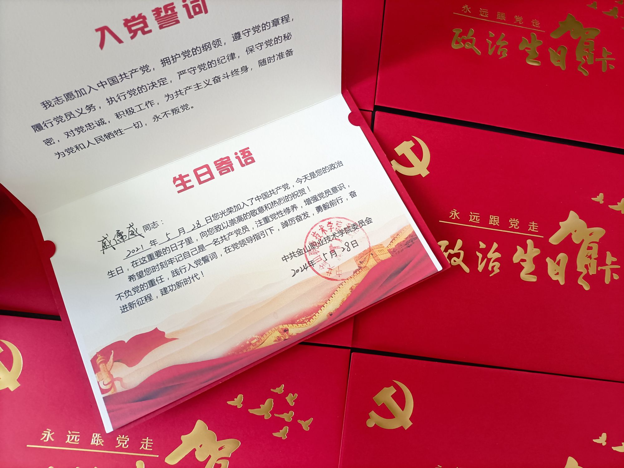 为进一步强化党员身份意识和责任意识,增强党员的荣誉感、责任感、归属感,强化基层党组织的向心力、凝聚力、战斗力,金山职业技术学院党委为全体党员发放“政治生日”贺卡。