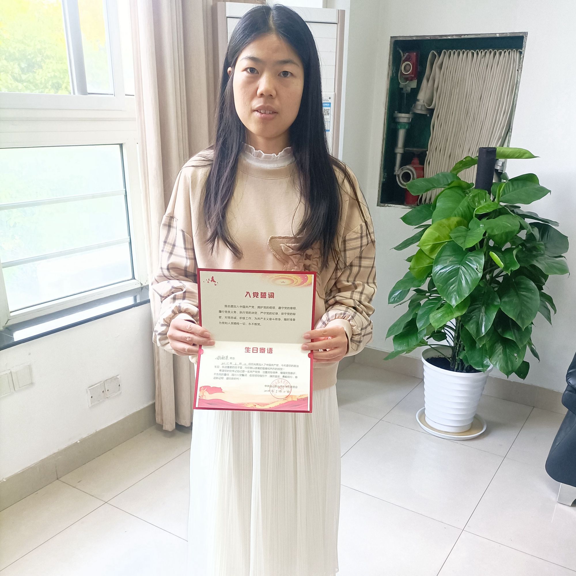 贺卡扉页上写着中国共产党入党誓词,虽然只有短短八十字,但这值得我们用一生去实践,政治生日寄语的字里行间,都承载着金山职业技术学院党委的祝福和期望,一张张政治生日贺卡,架起了党组织和党员之间的“连心桥”,送去了暖心祝福,一句句鞭策、激励的话语,不断提醒每一位党员,牢记党的宗旨,忠实履行党员的职责义务。