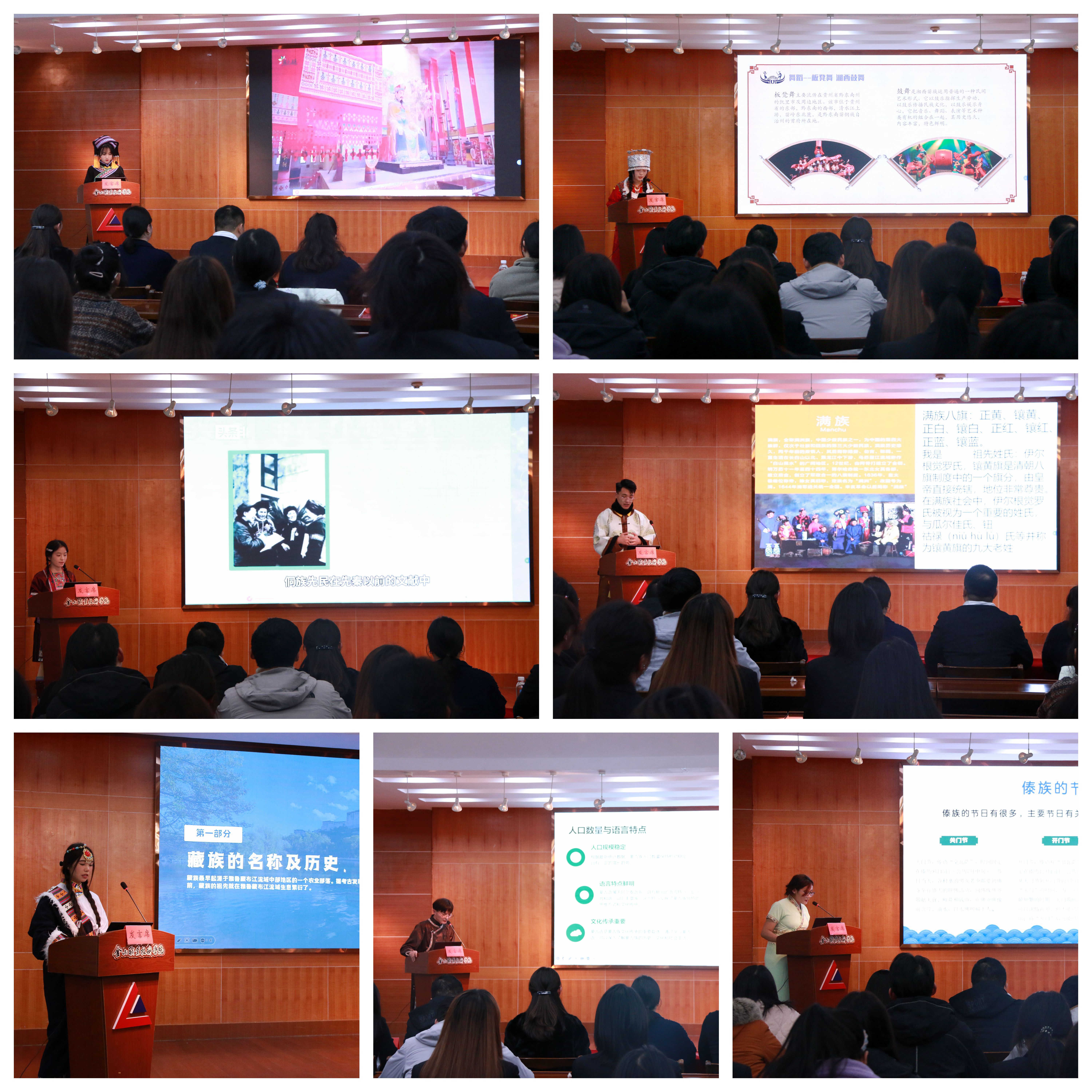 主持人孙余超老师向大家科普了我国的民族政策,增进大家对我国民族政策的认识和了解,使其认识到民族政策是我国政治制度的重要组成部分。活动邀请了来自瑶、苗、侗、满、藏、蒙古、傣共7个少数民族学生代表穿着传统服饰上台,生动形象的介绍本民族的历史文化、风俗习惯等。