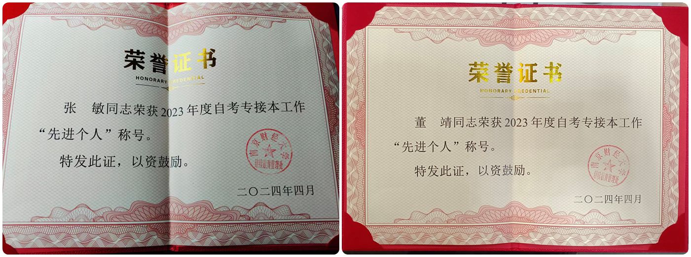 2024年4月11日,南京财经大学召开2024年自学考试“专接本”工作会议,会上,表彰了2023年度自考“专接本”工作“先进集体”和“先进个人”。我院荣获南京财经大学自学考试“专接本”工作“先进集体”,经济与贸易系张敏老师、本科教育管理部董靖老师荣获“先进个人”称号。