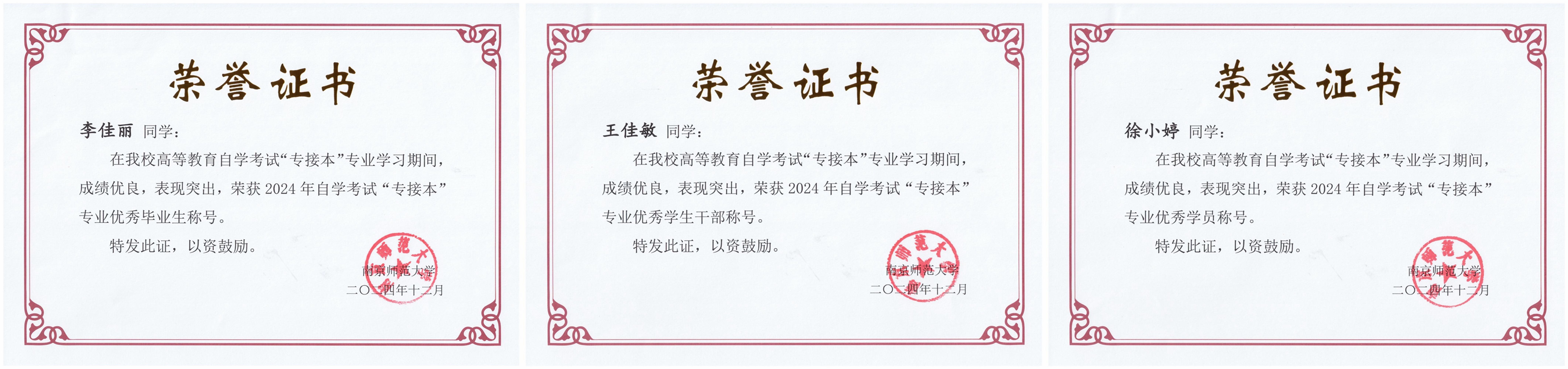 近日,我院“专接本”对接高校南京师范大学发文《关于表彰2024年自学考试优秀个人的通知》,现代服务与管理系22级旅游管理专业有3名学生获得2024年自学考试“专接本”专业个人荣誉称号,李佳丽同学获“优秀毕业生”称号,王佳敏同学获“优秀学生干部”称号,徐小婷同学获“优秀学员”称号。