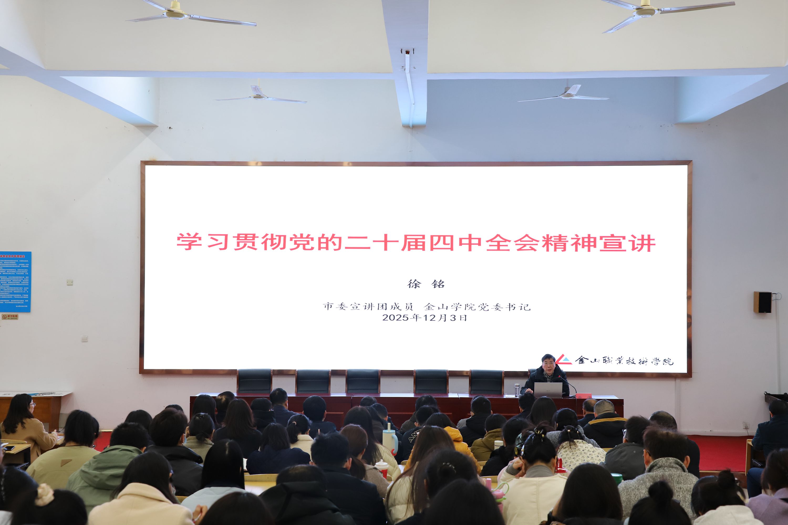 学院党委理论学习中心组率先垂范,通过专题会议开展集体学习,坚持读原著、学原文、悟原理,深入领会全会精神的核心要义。在此基础上,为帮助全校师生全面、系统、深入地理解全会精神,123日下午,我校在金山学堂举办了党的二十届四中全会精神专题宣讲会。校党委书记徐铭担任主讲,围绕全会的重大意义、十五五时期的历史方位与目标任务、战略举措等方面进行了全面深入的解读,并紧密结合学校发展实际,强调要坚持和加强党的全面领导,将全会精神切实贯彻落实到办学治校和立德树人的各项工作中。宣讲会视野开阔、论述深刻,对全校师生统一思想、凝聚力量、推动工作具有重要指导意义。