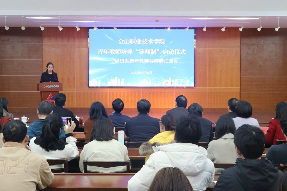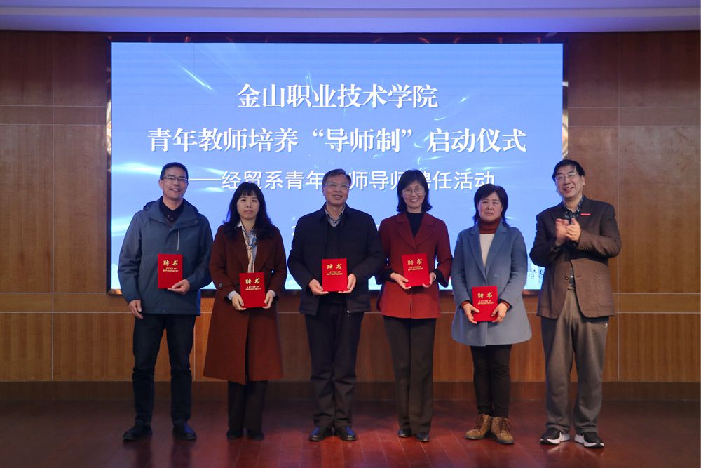 仪式上,学院副院长孙亚宣读《关于金山职业技术学院经济与贸易系试行“青年教师导师制”决定》,宣布在经济与贸易系试行“青年教师导师制”,聘请镇江高专原财贸学院党总支书记、院长朱冬林教授,高专财贸学院党总支书记、省“333工程”成员、镇江高专教学名师、镇江市十佳教师孙艳平教授,高专财贸学院副院长、镇江市“九三学社”镇江高专负责人兰洪元教授,镇江市民盟成员、高专财贸学院高晖教授,高专财贸学院陈庆苓教授,高专财贸学院院长、注册会计师,省“333工程”成员、镇江高专教学名师王旭等六位专家担任经济与贸易系青年教师发展指导教师,并在经济与贸易系组建四个团队,分别是教师教学能力大赛团队、科研服务团队、创新创业团队、学生技能竞赛团队。
