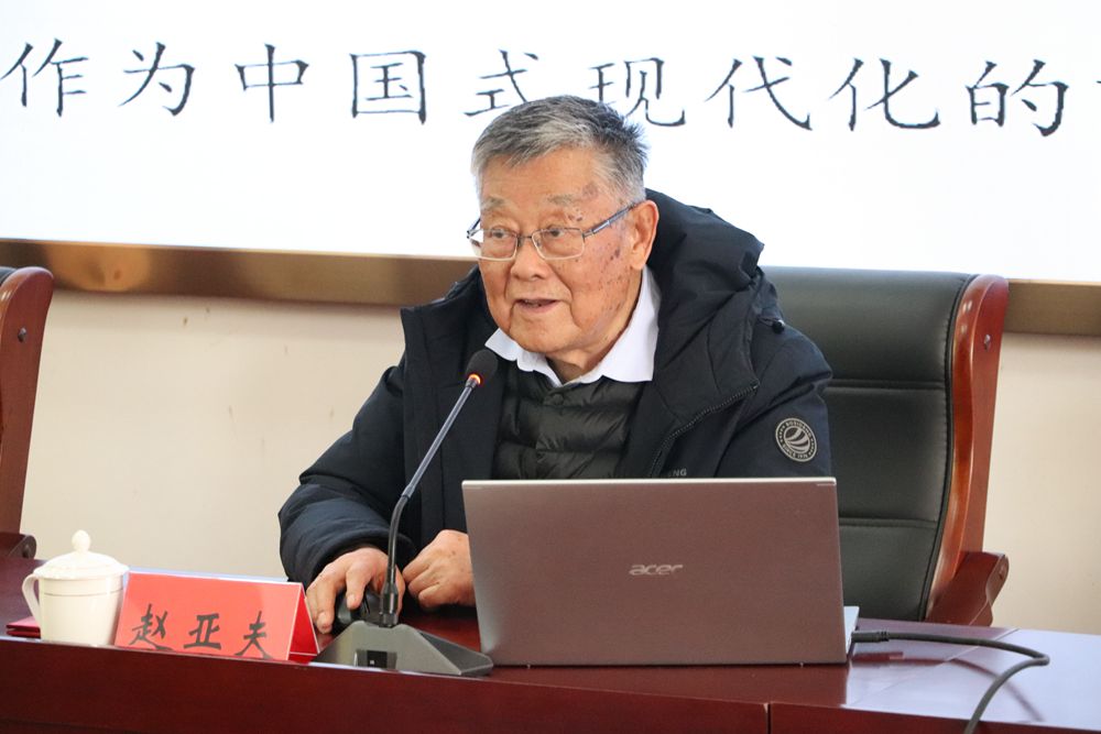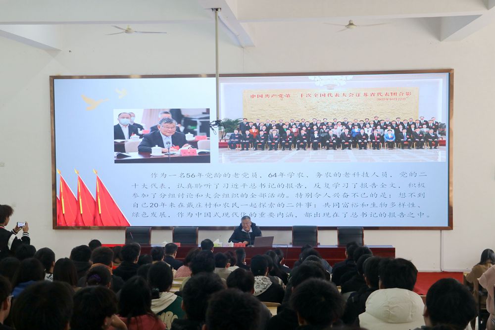 聘任仪式结束后,赵亚夫为师生作了二十大精神学习辅导报告,他以《为中国式农业现代化努力奋斗》为题,围绕学习贯彻党的二十大精神做了精彩辅导。在辅导报告中,赵老分享了自己60余年深入田间地头,“做给农民看、带着农民干、帮助农民销、实现农民富”的奋斗历程和心得体会。他以革命先烈瞿秋白、雷锋为榜样,扎根农村,服务农民,实实在在地践行着“把论文写在大地上,把成果留在农民家”。
