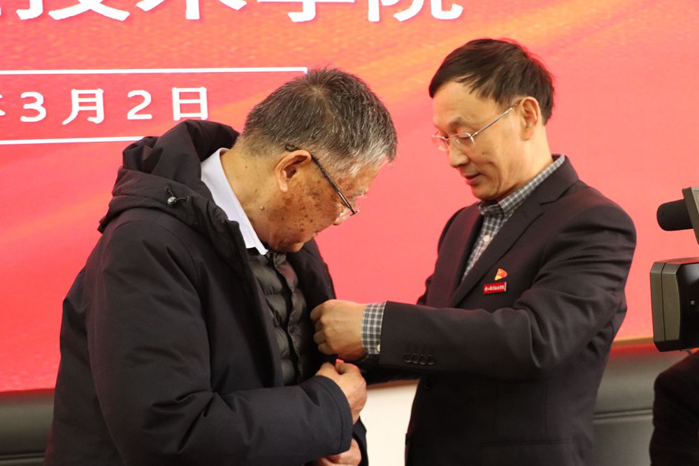 学院党委副书记印斌为赵亚夫颁发学院思想政治教育特聘教授聘书,学院执行院长朱小明为赵亚夫赠送校徽。