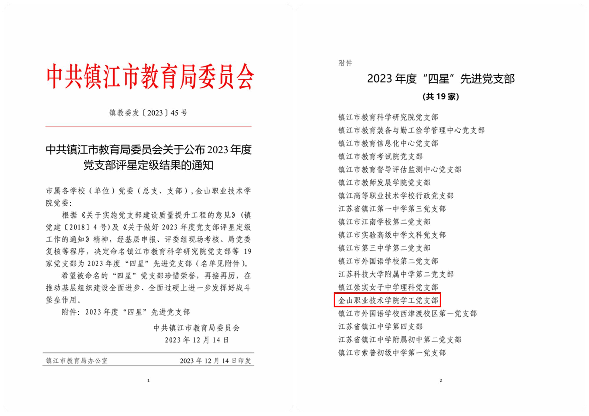 近日,镇江市教育局印发《中共镇江市教育局委员会关于公布2023年度党支部评星定级结果的通知》,其中金山职业技术学院学工党支部获评为2023年度“四星”先进党支部!