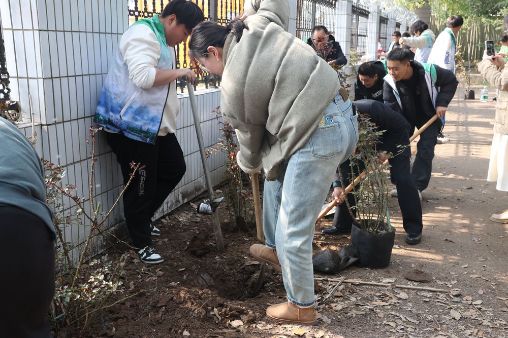 在现场,师生们协力铲土挖坑、挥锹培土、夯实土层、扶紧树苗……配合默契,满载着期待和热情,有序地将140余棵月季花树苗一棵棵栽进土壤。一阵忙碌之后,这些稚嫩的树苗在春日阳光下摇曳沐浴,犹如绿色精灵,昭示着生命的坚韧,充满着无尽的活力和生机。