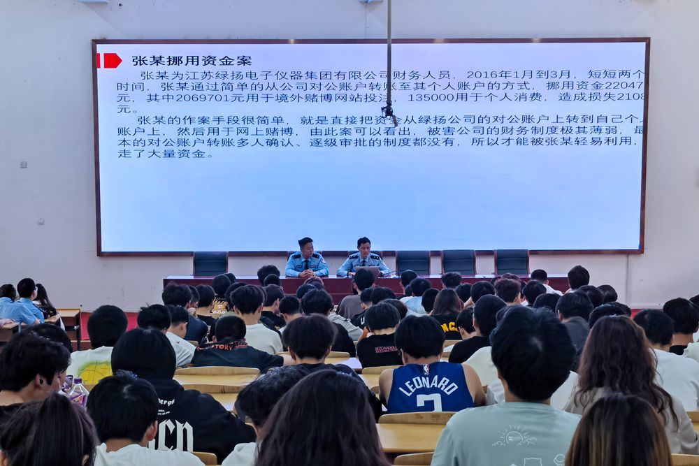 5月13日下午,我院联合扬中市城东派出所开展防范经济犯罪和网络诈骗宣传活动。活动在金山学堂举行,共计250名学生参加活动。