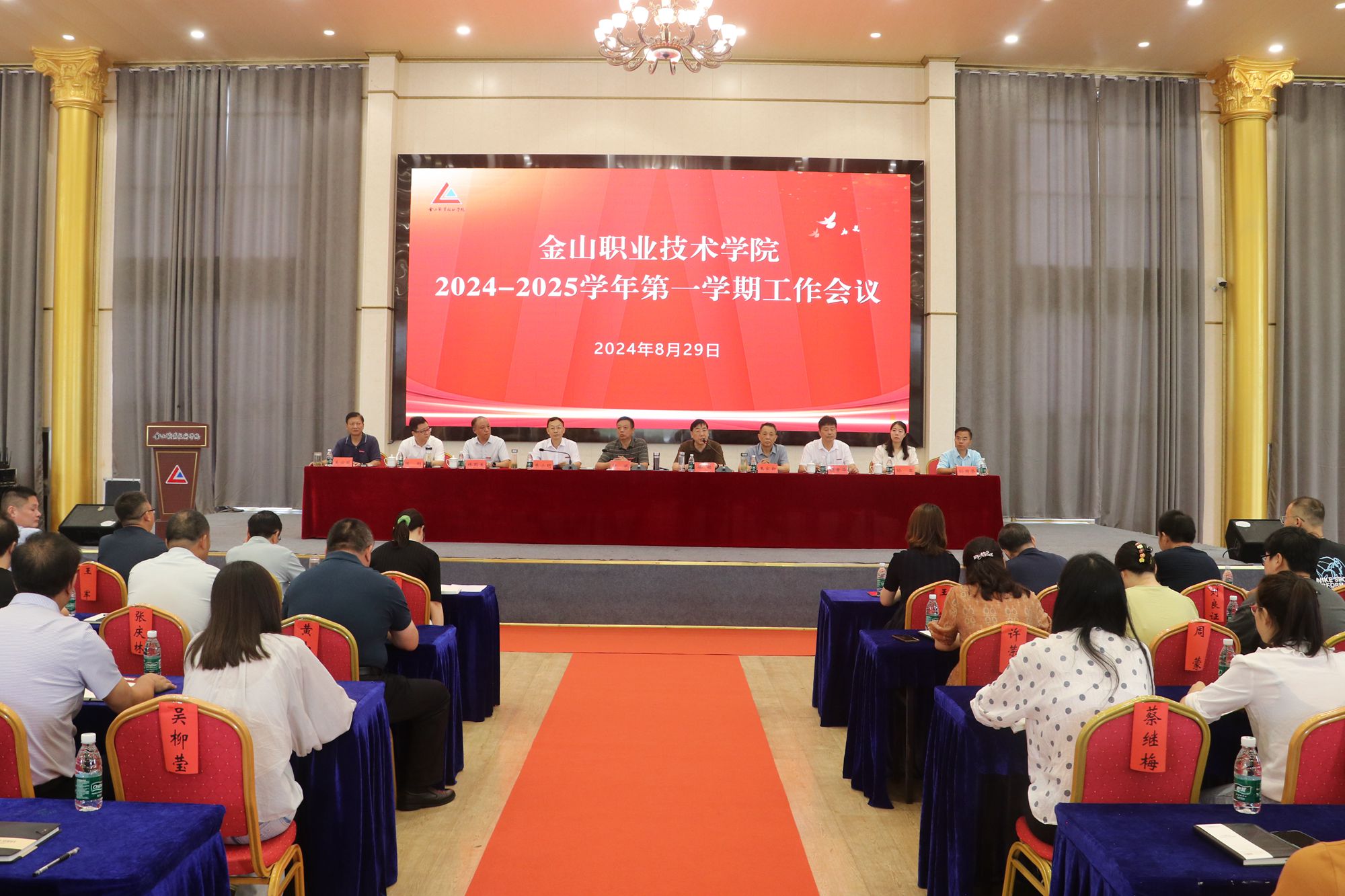 2024年8月29日上午,金山职业技术学院2024-2025学年第一学期工作会议在金山艺术馆隆重召开。学院全体教职工出席会议,领导班子全体成员在主席台就座。学院执行院长朱小明作学院新学期工作报告,理事长印斌作讲话,学院党委书记徐铭主持会议。